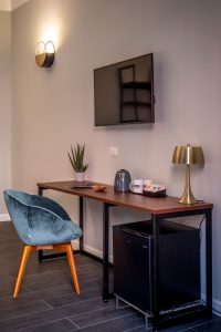 Questa ampia suite dispone di letto matrimoniale, scrivania e zona lettura e offre la possibilità di inserire un terzo letto. L’atmosfera è elegante, curata in ogni particolare. L’arredamento esclusivo e studiato su misura si ripropone anche in questa camera, dedicata al Castel Nuovo, comunemente conosciuto come Maschio Angioino.